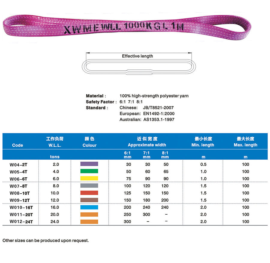 Synthetic fabric lifting belt (hereinafter refers to lifting belt) is a kind of soft lifting belt made of non-metallic materials and successor production of wire rope and chain in the lifting industry which is lighter and more convenient than similar metal and can solve the difficult problems such as large tonnage but small lifting space in the lifting process. The lifting belt is light, convenient and durable. Additionally, it has a noticeable earthquake effect, non-conductive performance, anti-corrosion and protects hanging items from being scratched. Many fracture experiments proved that lifting belt almost inflict zero reverse damage to metallic rope chain. The lifting belt adopts international standard colors to distinguish carrying tonnage. In the application process, carry tonnage can be distinguished by lifting belt jacket color if label on lifting belt wears Synthetic fabric lifting belt was used worldwide in the early days and has an application history spanning over fifty years. After being popularized in China for more than twenty years, it has gradually replaced wire rope rigging and chain rigging in many industries.