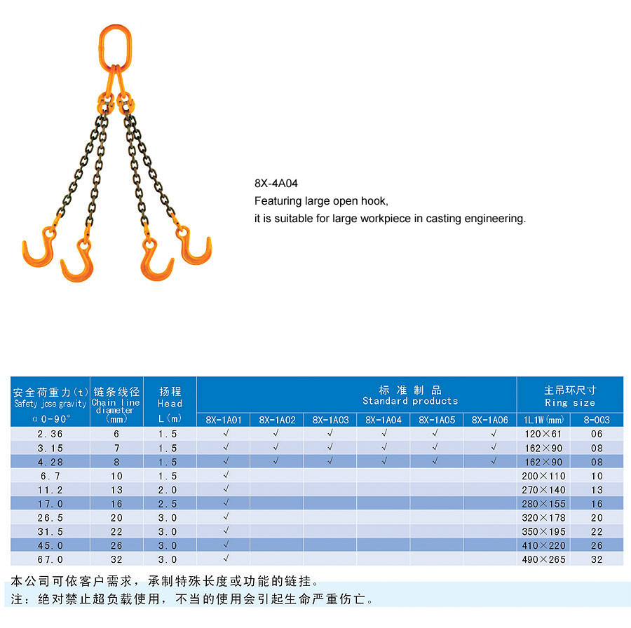Chain rigging is a kind of rigging formed by connecting metallic chain links, which is divided into two categories in form, namely welding type and assembling type and falls into single foot and multi-feet in structure. The chain rigging is made of high quality alloy steel, boasts wear resistance, high strength, durability and flexibility and is suitable for large scale and frequent usage. Additionally, it is anti-radiation and high temperature(-40~200℃) and is suitable for lifting hot steel billet and steel coil. The flexible multiple feet and various combinations can improve efficiency and cut cost. The company offers general types of ship store, accessories and marine spare supply and technical services and it aims to provide best products and services for our customers.