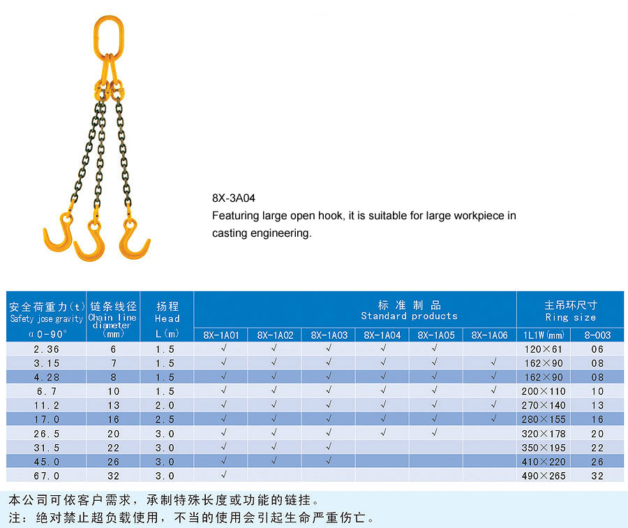 Chain rigging is a kind of rigging formed by connecting metallic chain links, which is divided into two categories in form, namely welding type and assembling type and falls into single foot and multi-feet in structure. The chain rigging is made of high quality alloy steel, boasts wear resistance, high strength, durability and flexibility and is suitable for large scale and frequent usage. Additionally, it is anti-radiation and high temperature(-40~200℃) and is suitable for lifting hot steel billet and steel coil. The flexible multiple feet and various combinations can improve efficiency and cut cost. The company offers general types of ship store, accessories and marine spare supply and technical services and it aims to provide best products and services for our customers.