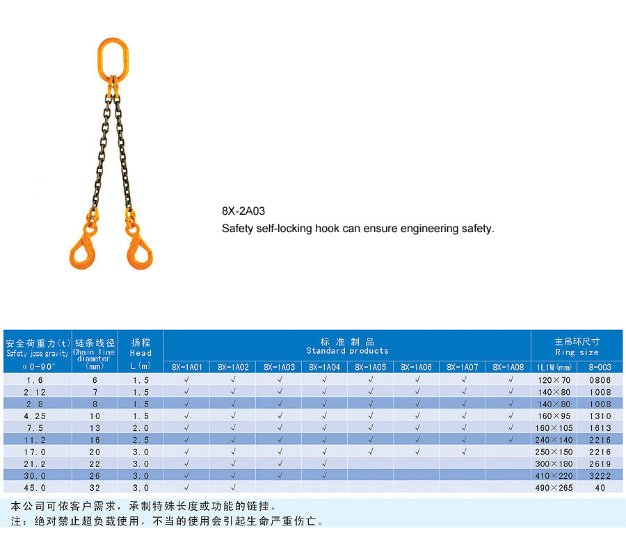Chain rigging is a kind of rigging formed by connecting metallic chain links, which is divided into two categories in form, namely welding type and assembling type and falls into single foot and multi-feet in structure. The chain rigging is made of high quality alloy steel, boasts wear resistance, high strength, durability and flexibility and is suitable for large scale and frequent usage. Additionally, it is anti-radiation and high temperature(-40~200℃) and is suitable for lifting hot steel billet and steel coil. The flexible multiple feet and various combinations can improve efficiency and cut cost. The company offers general types of ship store, accessories and marine spare supply and technical services and it aims to provide best products and services for our customers.