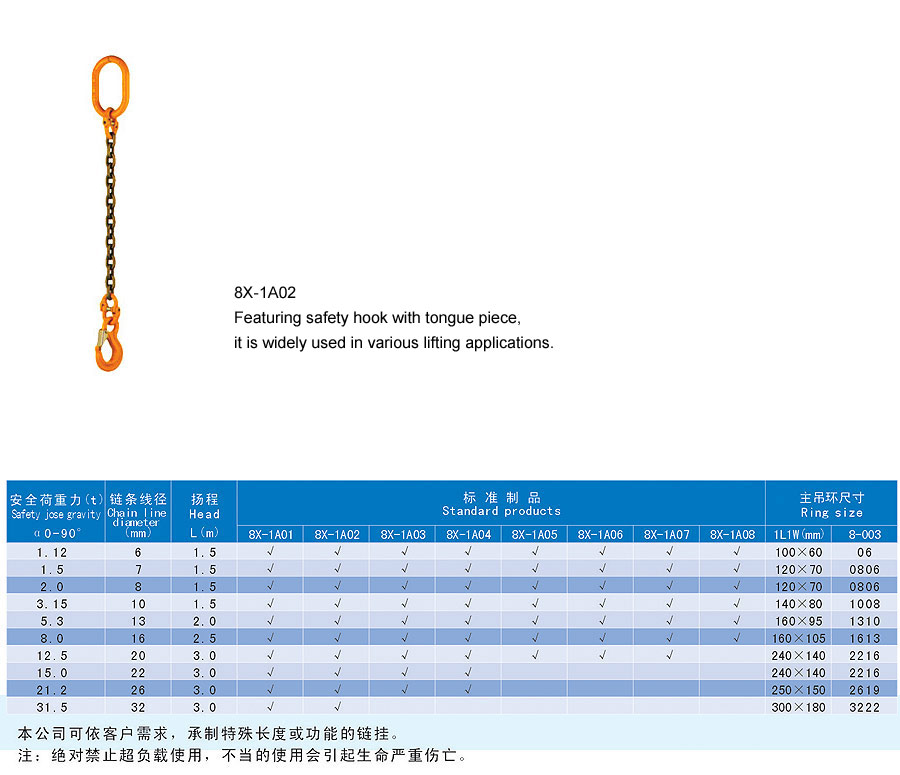 Chain rigging is a kind of rigging formed by connecting metallic chain links, which is divided into two categories in form, namely welding type and assembling type and falls into single foot and multi-feet in structure. The chain rigging is made of high quality alloy steel, boasts wear resistance, high strength, durability and flexibility and is suitable for large scale and frequent usage. Additionally, it is anti-radiation and high temperature(-40~200℃) and is suitable for lifting hot steel billet and steel coil. The flexible multiple feet and various combinations can improve efficiency and cut cost. The company offers general types of ship store, accessories and marine spare supply and technical services and it aims to provide best products and services for our customers.