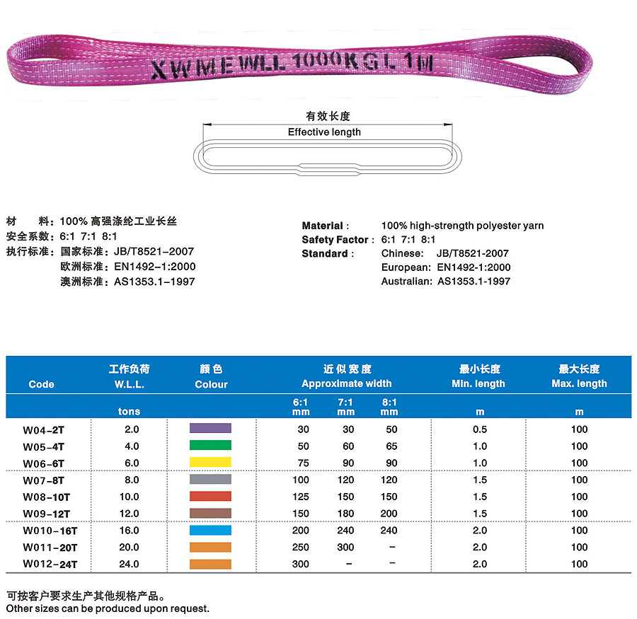 合成纖維吊裝帶(以下簡稱吊裝帶)為軟吊裝帶,采用非金屬原料,屬吊裝行業(yè)中鋼繩、鏈條的換代產(chǎn)品,比同類金屬繩相對輕便。能解決實際吊裝過程中大噸位、小吊裝空間的吊裝難題。吊裝帶有輕便、使用壽命長、減震性能好、不導(dǎo)電、不易腐蝕、保護(hù)被吊物品不被刮傷等特點。多次的斷裂試驗表明,吊裝帶相對于金屬繩鏈產(chǎn)生的反向傷害幾乎為零。吊裝帶采用國際標(biāo)準(zhǔn)色來區(qū)分承載噸位,在使用過程中,吊帶裝上的標(biāo)簽?zāi)p后,可能過吊裝帶外套的顏色來識別承重重量。合成纖維吊裝帶在國際上起步較早,至今已有著五十多年的應(yīng)用歷史,在經(jīng)過二十多年的國內(nèi)推廣應(yīng)用,以其獨有的顯著優(yōu)勢,早許多行業(yè)正逐步替代鋼絲繩索具和鏈條索具。
