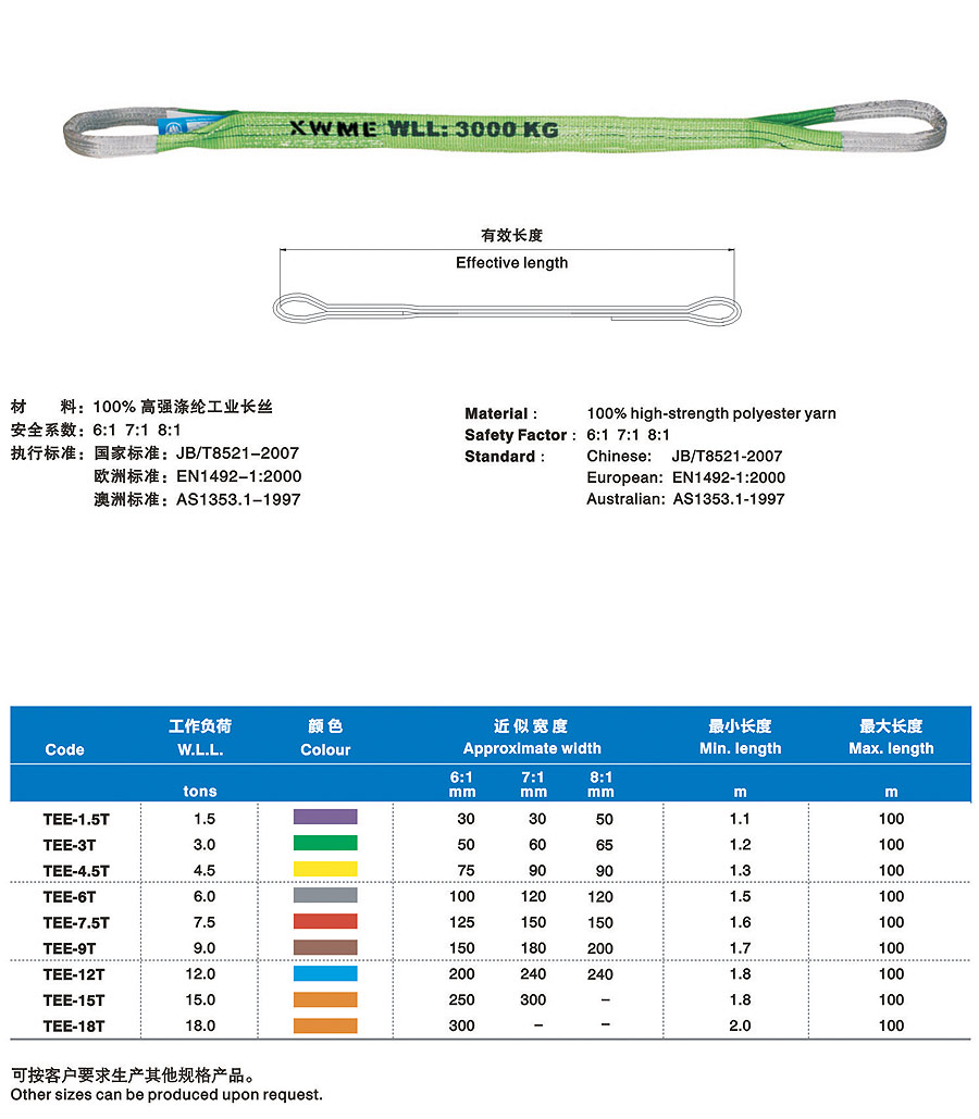 合成纖維吊裝帶(以下簡稱吊裝帶)為軟吊裝帶,采用非金屬原料,屬吊裝行業(yè)中鋼繩、鏈條的換代產(chǎn)品,比同類金屬繩相對(duì)輕便。能解決實(shí)際吊裝過程中大噸位、小吊裝空間的吊裝難題。吊裝帶有輕便、使用壽命長、減震性能好、不導(dǎo)電、不易腐蝕、保護(hù)被吊物品不被刮傷等特點(diǎn)。多次的斷裂試驗(yàn)表明,吊裝帶相對(duì)于金屬繩鏈產(chǎn)生的反向傷害幾乎為零。吊裝帶采用國際標(biāo)準(zhǔn)色來區(qū)分承載噸位,在使用過程中,吊帶裝上的標(biāo)簽?zāi)p后,可能過吊裝帶外套的顏色來識(shí)別承重重量。合成纖維吊裝帶在國際上起步較早,至今已有著五十多年的應(yīng)用歷史,在經(jīng)過二十多年的國內(nèi)推廣應(yīng)用,以其獨(dú)有的顯著優(yōu)勢(shì),早許多行業(yè)正逐步替代鋼絲繩索具和鏈條索具。
