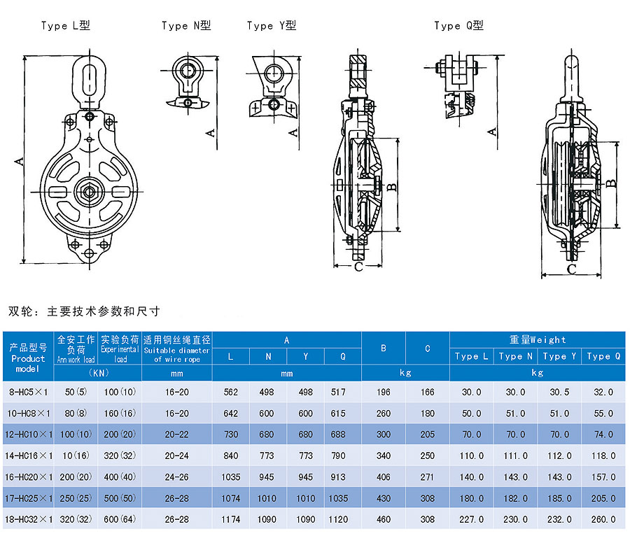 滑車按輪數(shù)的多少分為單門滑車,雙門滑車和多門滑車。按滑車與吊物的連接方式可分為吊鉤式滑車,鏈環(huán)式滑車,吊環(huán)式滑車和吊架式滑車四種。一般中小型的滑車多司于吊鉤式、鏈環(huán)式和吊環(huán)式,而大型滑車采用吊環(huán)式和吊梁式。按輪和軸的接觸不同可分為輪軸間裝滑動軸承及滾動軸承兩種。按夾板是否可以打開來分,有開口滑車和閉口滑車。開口滑車的夾板是可以打開的,便于裝繩索,一般的都是單門滑車,它常用于扒桿底腳處作導(dǎo)向滑車用。滑車按使用的方式不同又分為定滑車和動滑車。使用方便,用途廣泛,可以手動,機(jī)動。主要用于工廠、礦山、農(nóng)業(yè)、電力、建筑的生產(chǎn)施工,碼頭、船塢、倉庫的機(jī)器安裝,貨物起吊等。